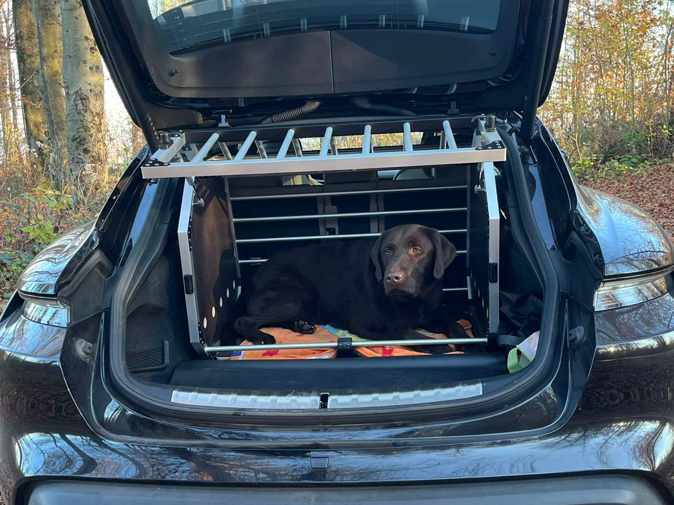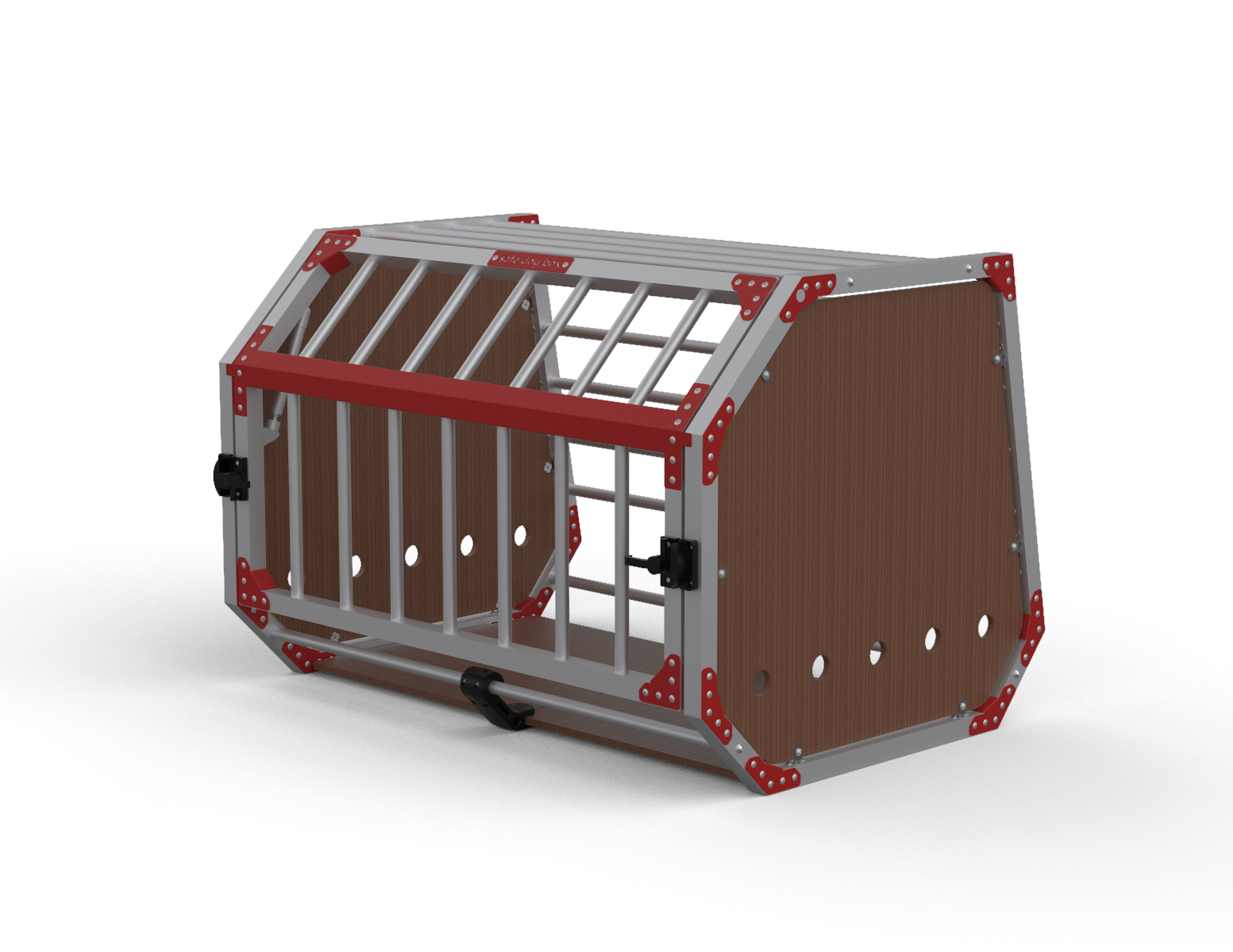 A crate designed for placement in your car's trunk. The doors open upward and feature double-locking handles, ensuring maximum use of the available space in your vehicle. You can choose the crate size to fit the entire trunk or just a portion of it, depending on your preference. Your dog will be very happy.